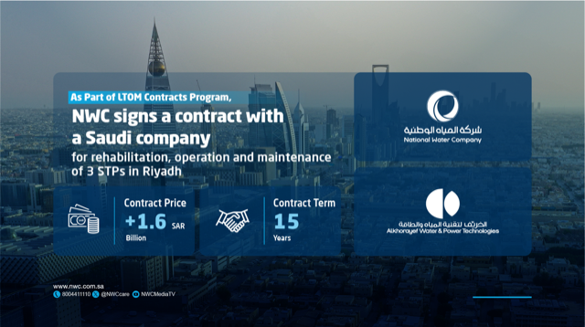 Riyadh, Saudi Arabia, 6 August, 2023: The National Water Company (NWC) announced that it has awarded a Long-Term Operation and Maintenance (LTOM) contract for the rehabilitation, operation and maintenance of sewage treatment plants (STPs) in Manfouha, Riyadh, to Alkhorayef Water and Power Technologies Company (AWPT). The contract spans 15 years and is worth more than SAR1.6 billion. The project is meant to contribute to the objectives of the National Water Strategy aimed at achieving environmental sustainability, increasing investments in the water sector, and opening up partnership opportunities for the private sector. This is executed under an innovative agreements model that aims at engaging the private sector in investment opportunities involving the rehabilitation, operation and maintenance of NWC strategic assets.