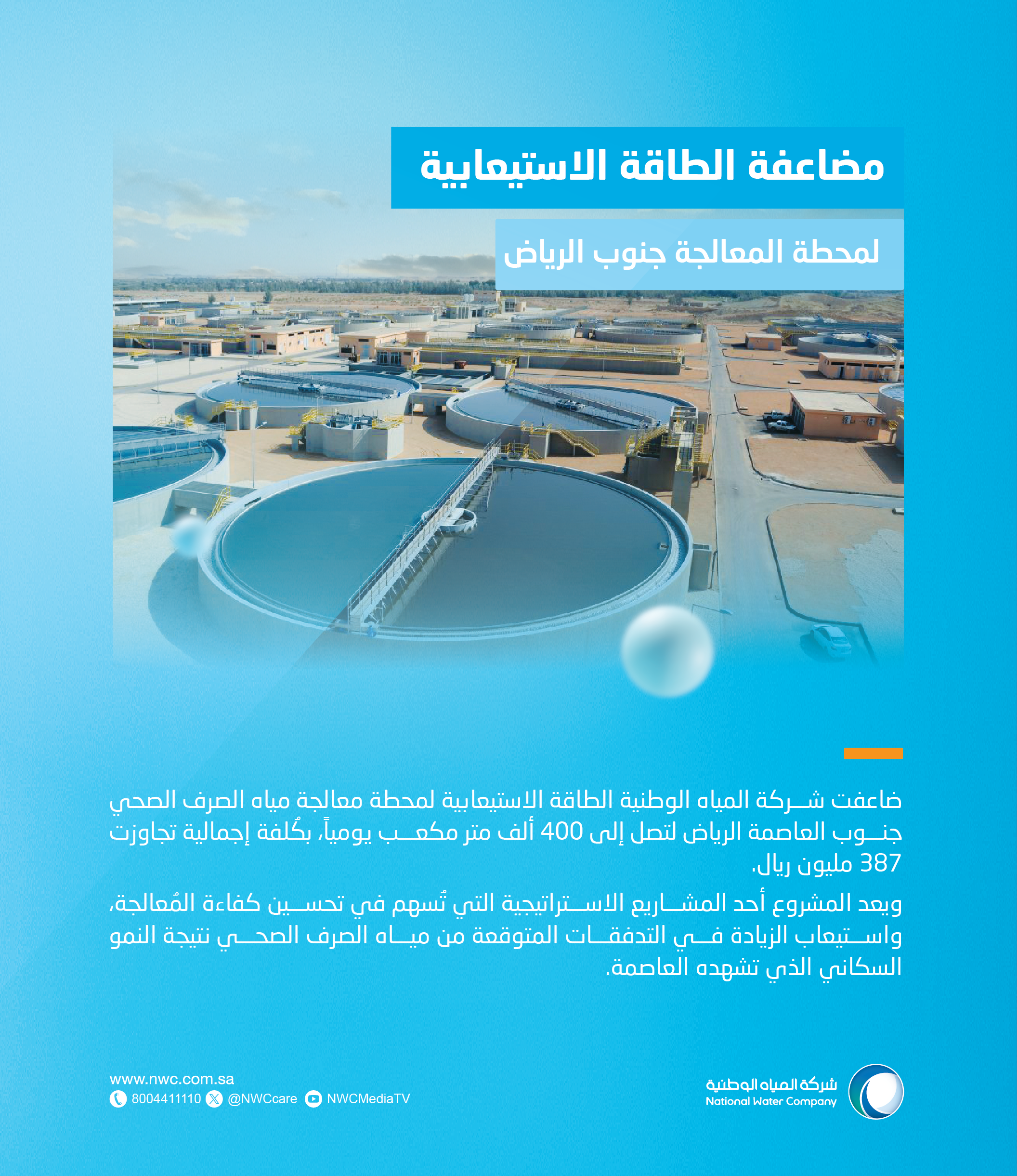 The company elaborated that the project is one of the strategic projects that contributes to the development of the wastewater treatment system, improve the efficiency of treatment and absorb the increase in expected wastewater flows as a result of urban expansion and increasing population growth witnessed by the capital, Riyadh.