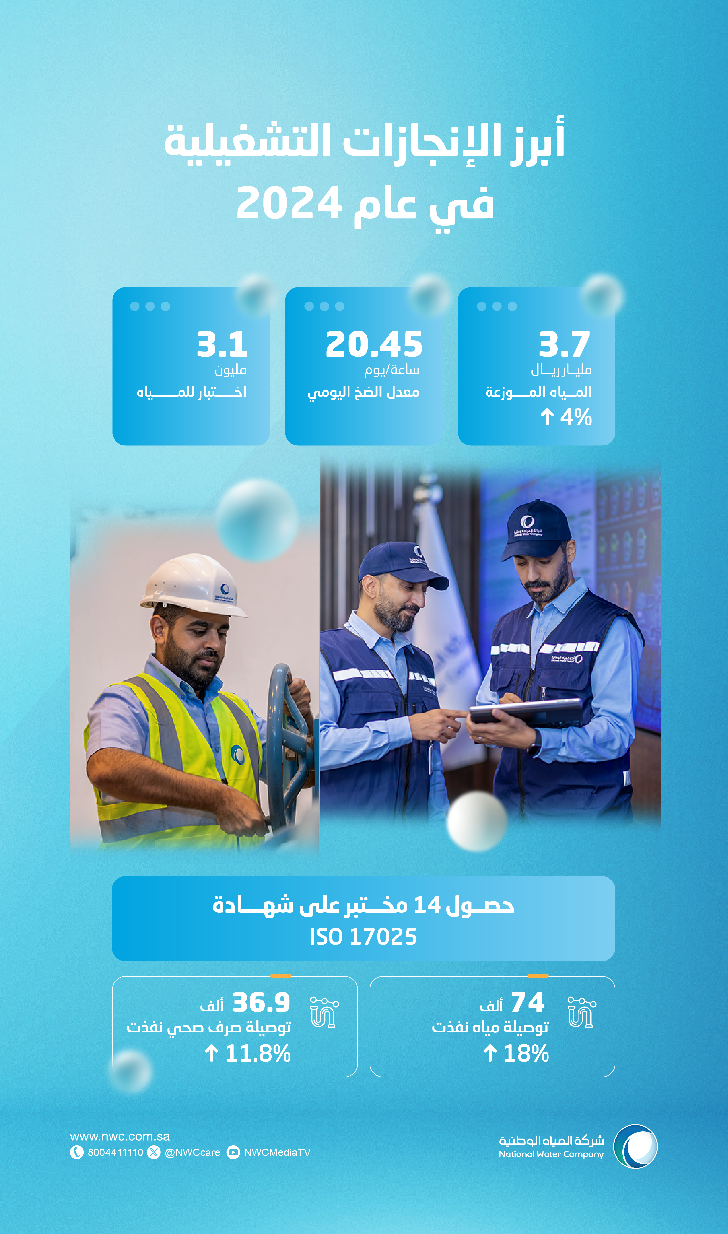 NWC explained that these accomplishments are a continuation of the Kingdom's efforts to increase the efficiency of its operational system in the water and sanitation services sectors and an expansion of the provision of reliable and comprehensive services to meet the growing demand for water and keep pace with the comprehensive development witnessed by the Kingdom.